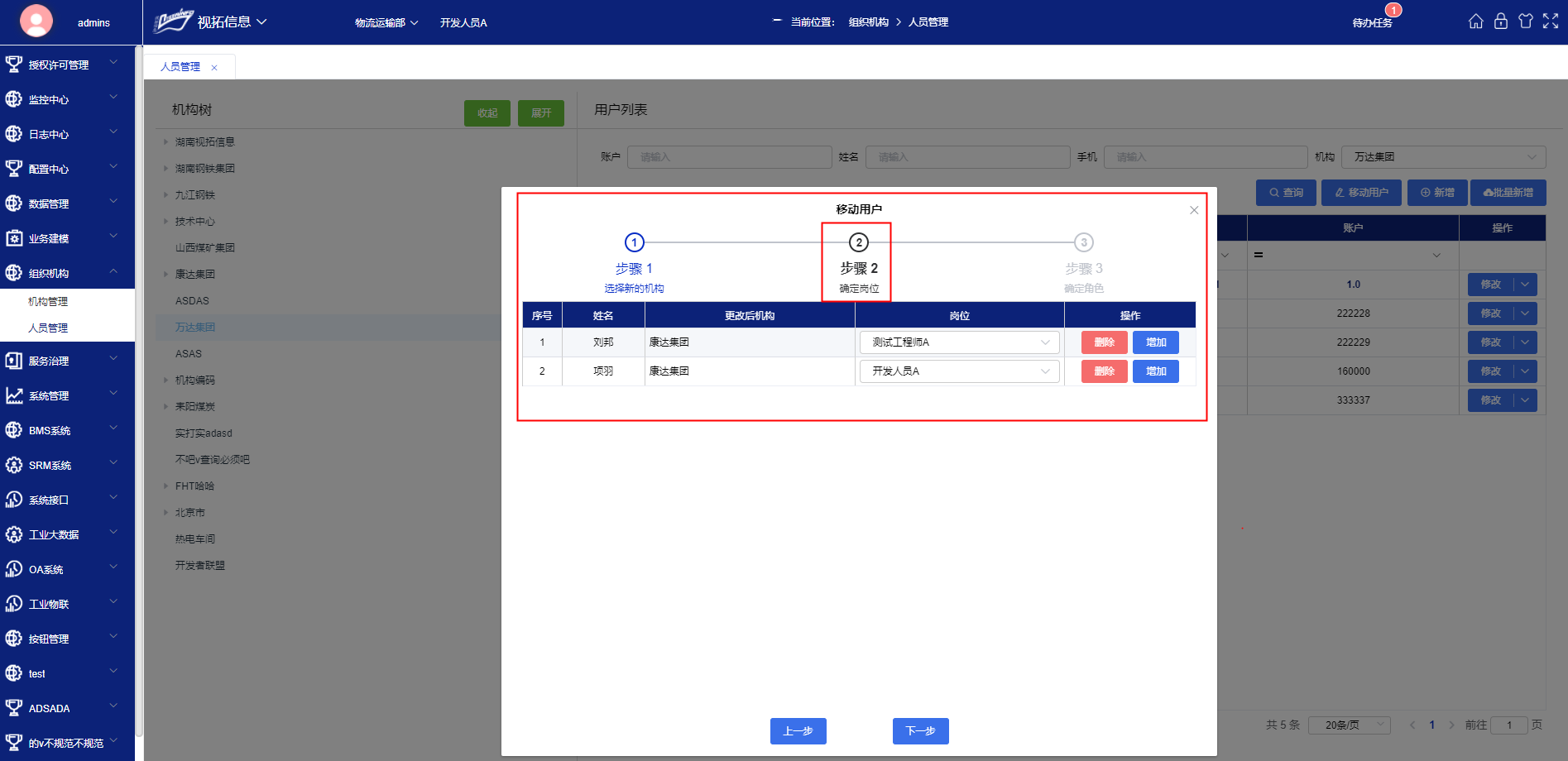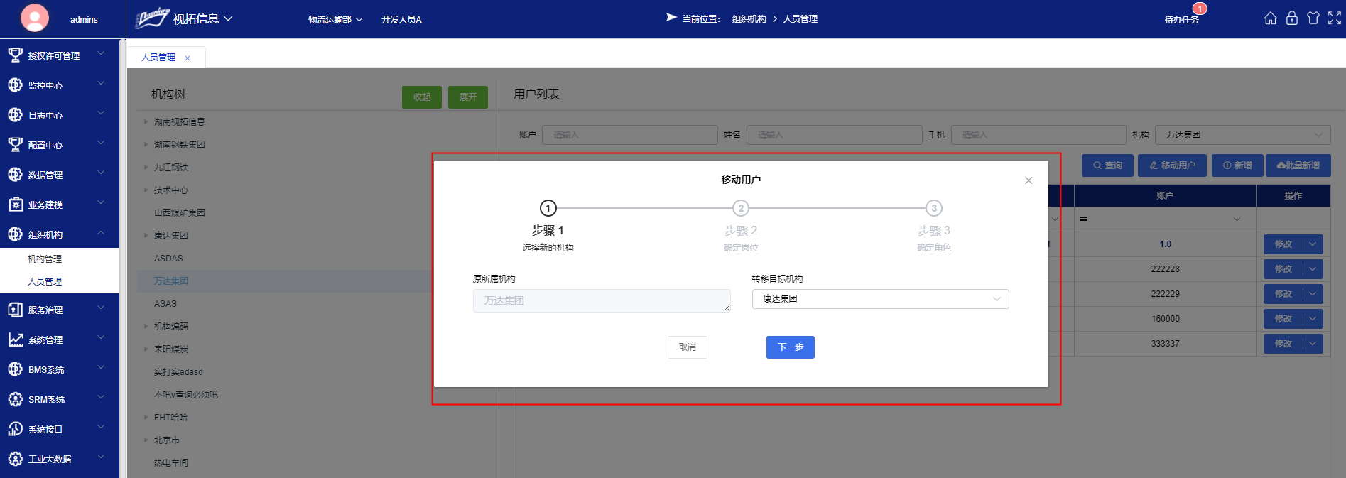 弹出移动用户窗口,选择新的机构;如下图所示: