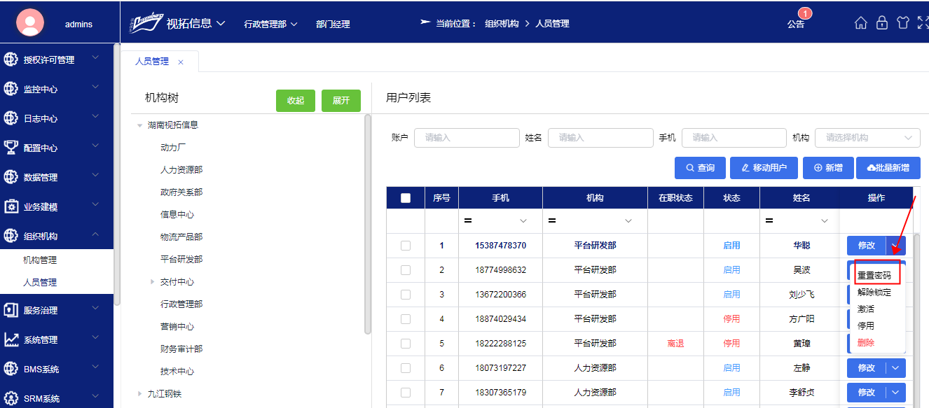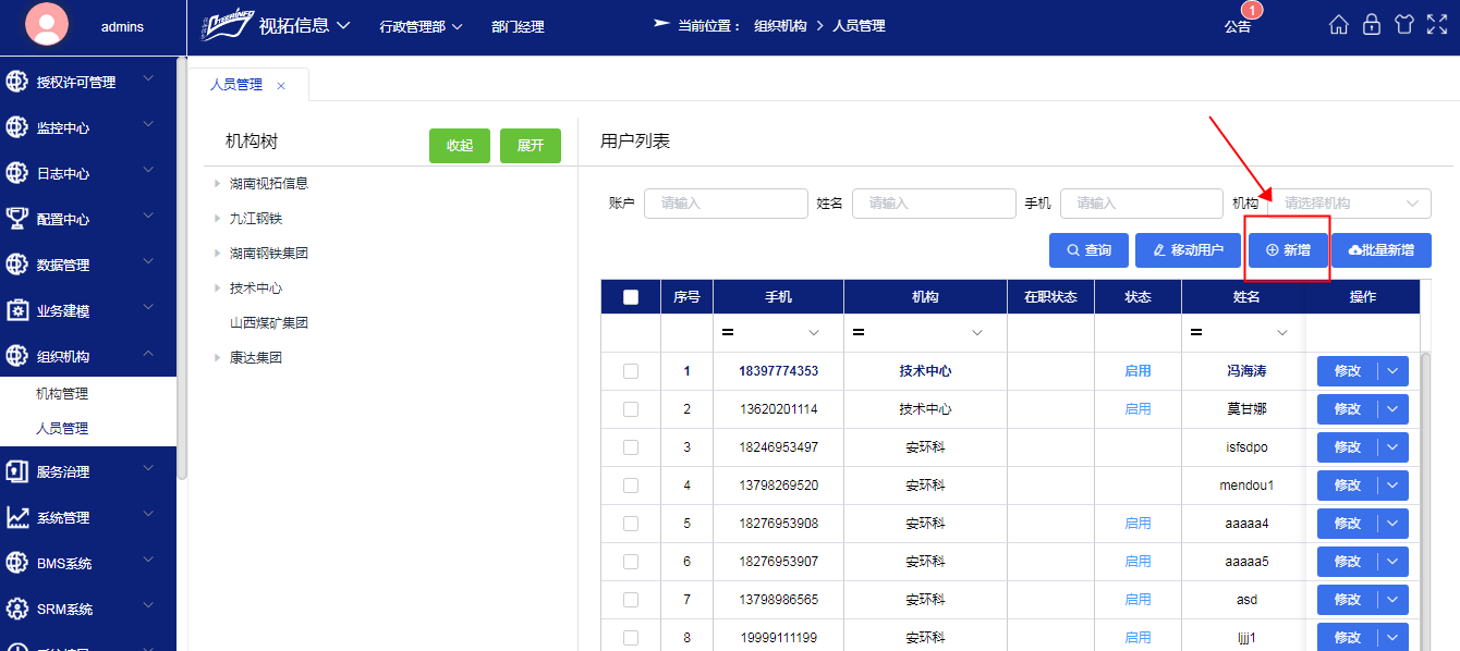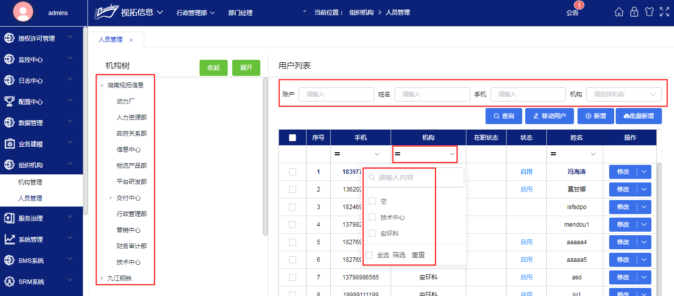 可以根据机构树、账户、姓名、手机、机构名、字段进行查询;如下图所示: