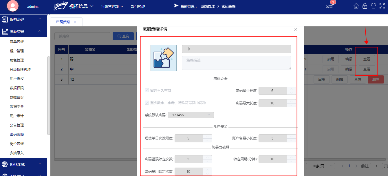 点击“查看”按钮查看密码策略详情;如下图所示: