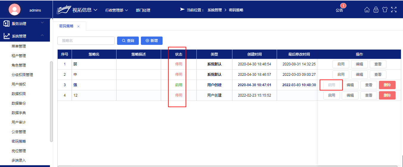 启用密码策略后,用户配置密码会使用该策略规则;只能启用一个面策略;如下图所示: