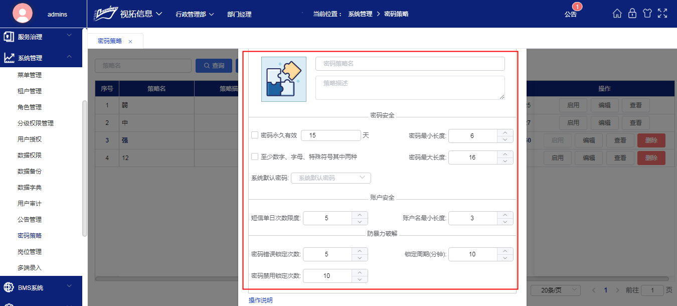 密码策略是针对用户密码的配置规则,主要包括系统的初始密码设定,用户修改密码需满足的规则,用户创建时用户编码的限制条件,登陆错误锁定/密码禁用锁定次数,错误锁定的时间周期。