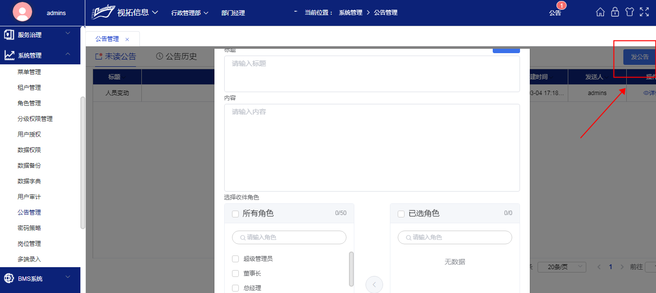 点击“发公告”按钮,进行发布公告;