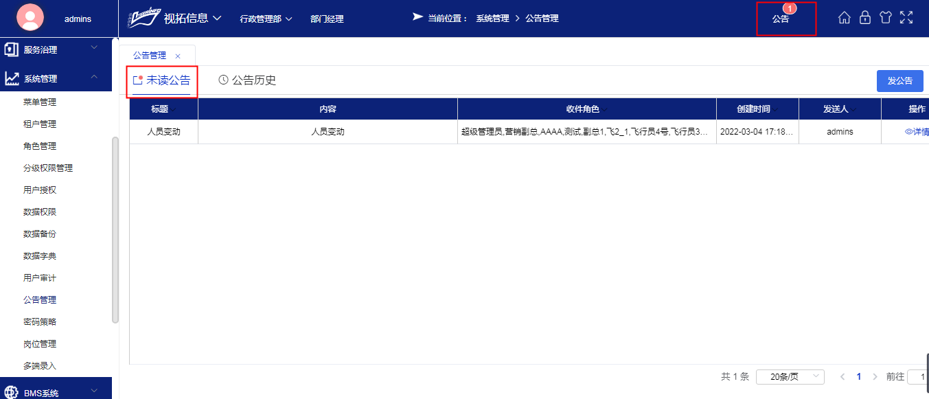 未读公告会有相应提示未读;如下图所示: