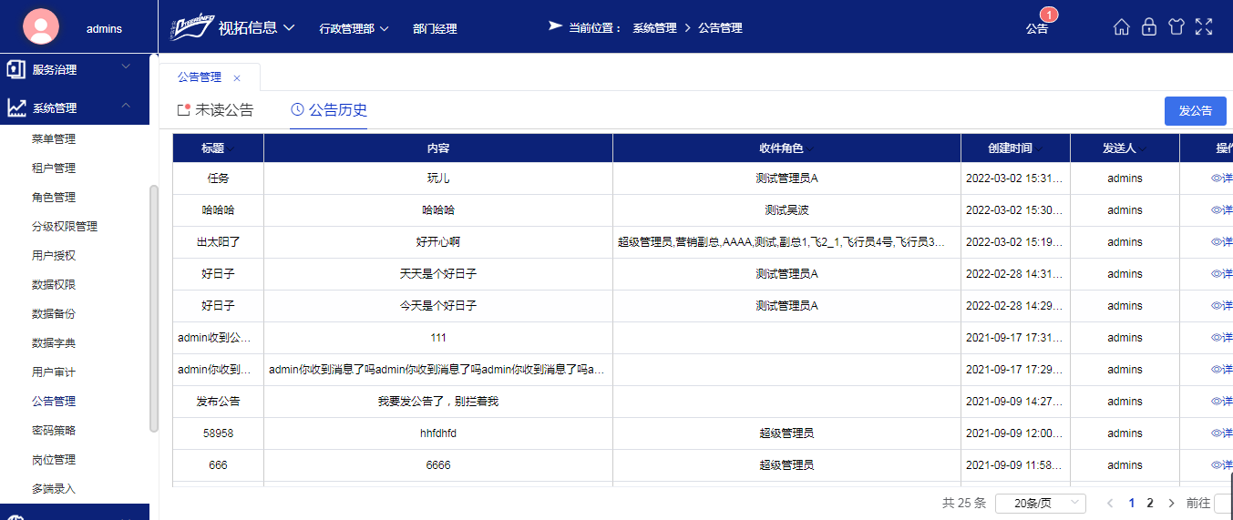 发布公告,对公告进行管理。