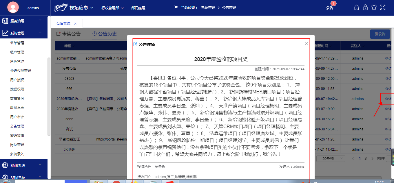 点击“详情”按钮查看公告详情。
