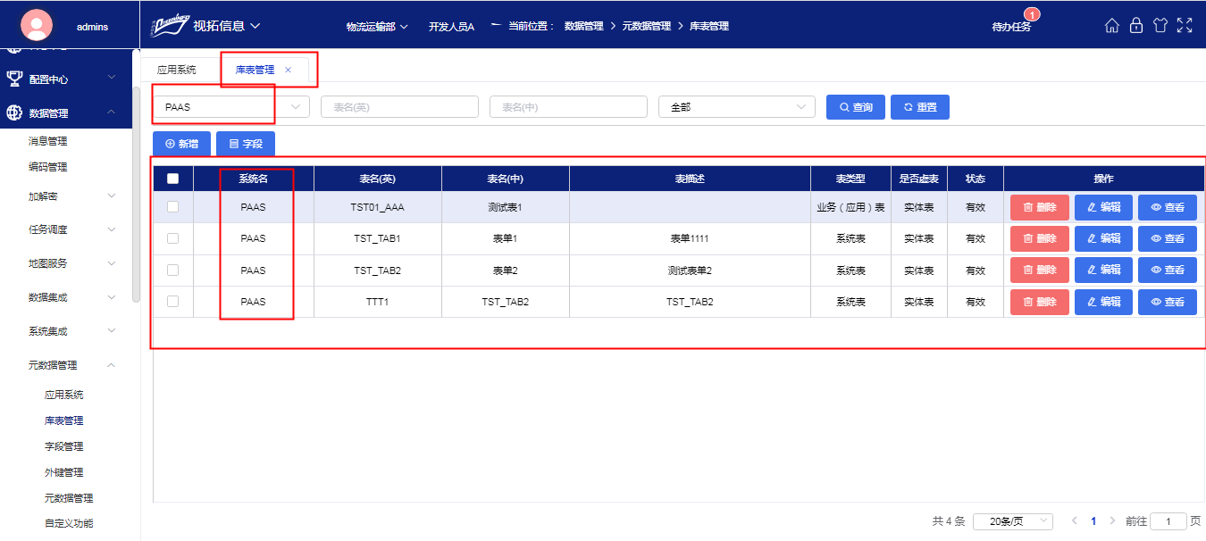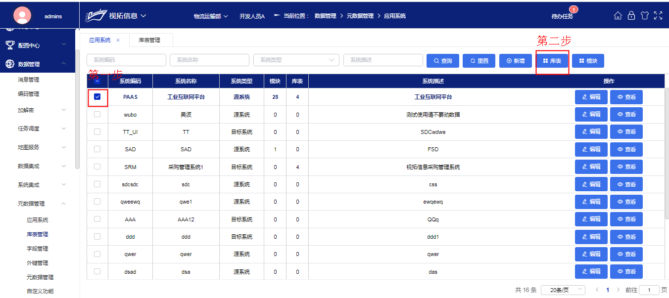 查看一个应用系统的库表详情;先选中一个应用系统,再点击“库表”按钮(查看应用系统的模块详情同下操作)如下图所示: