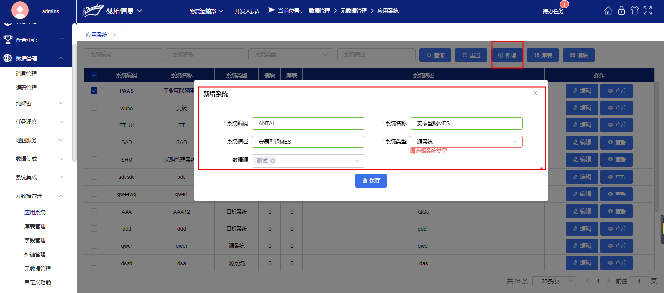点击“新增”按钮,弹出新增界面,输入正确信息保存(注:数据源需要先在元数据管理配置且有效启用状态)如下图所示: