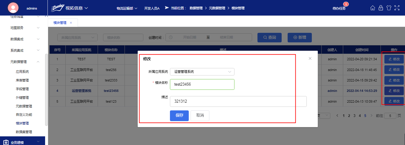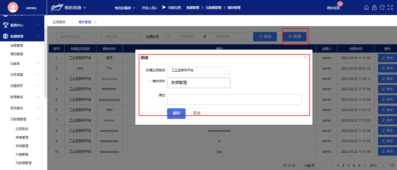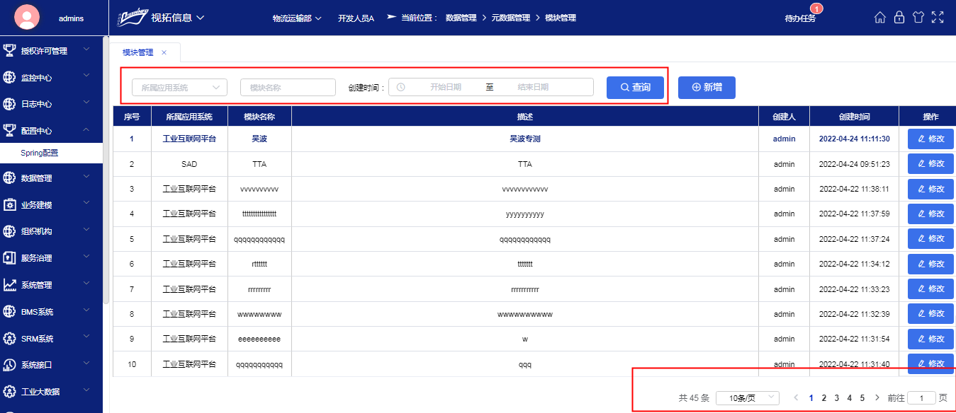 可以根据所属应用系统、模块名称、创建时间段、分页进行查询;如下图所示: