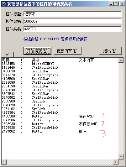 > 说明:打开记事本随便输入点内容,然后点击右上角关闭,这时我们会看到是否保存的对话框,里面有3个按钮,通过工具查看发现它们的类名都是“Button”,并且次序正好是依次的1、2、3,这时我们测试获取和3个按钮的句柄。