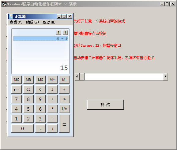 > 说明:直接运行下面代码即可,效果为软件自动调用计算器,然后计算6+9的结果: