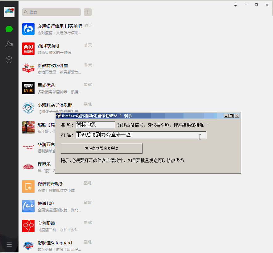 本案例是通过clsWindow2.2控制微信桌面版来发送消息的。原理是模拟人工操作:进入微信桌面版 -> 点击搜索框 -> 输入对应人员名 -> 点击搜索结果 -> 输入框中输入消息 -> 按回车,代码注释很详细,看下就能明白,有一定vb基础的人可以改成群发,定时发送,群中@发送。