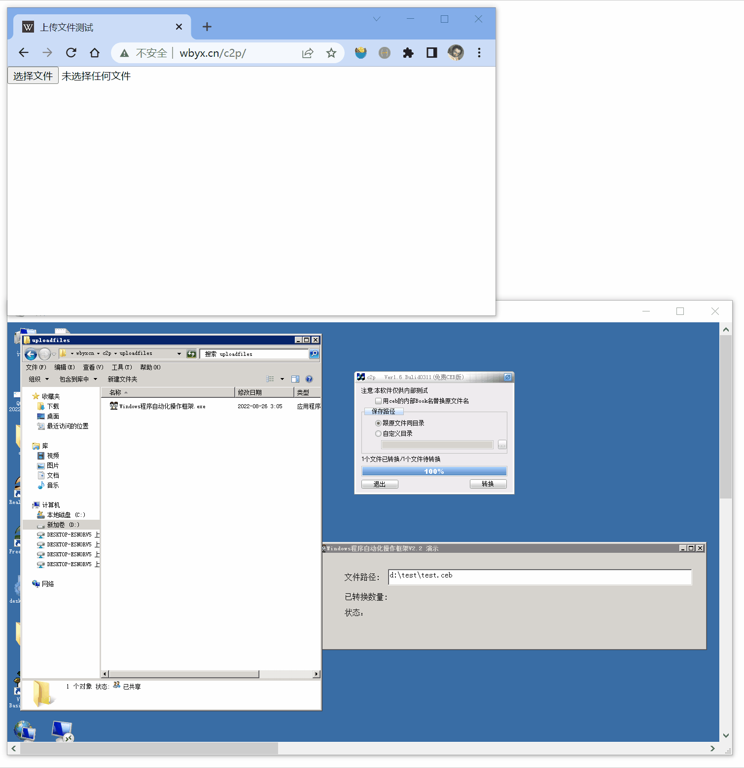 图中上半截那个窗口是本地电脑上我手动操作的。下面的窗口是远程桌面那边自动化操作的。鼠标点击了上传ceb文件,服务器那儿发现有新文件过来后进行自动点击操作,当然还需要优化下,比如服务器那边转换好了后web端再显示pdf完整URL才好。