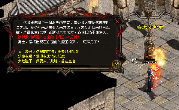 进入恶魔城后,怪物会分批次出现攻击天玉公主,玩家需要击杀怪物保护天玉公主,实力强大的怪物可以使用灵符直接封印,每消灭一波怪物会获得一次奖励,通过一关可获得中等奖励,通过全部关卡可获得大量奖励,向国王汇报可获得国王大奖。国王同时会开启黑暗殿堂传送,击杀黑暗殿堂怪物可找密室守护者领取奖励!