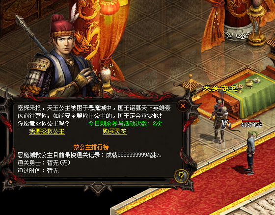 简介:国王招募天下英豪前往天关恶魔城营救公主,成功营救出公主可获得国王的奖励,活动每天可以参加3次。