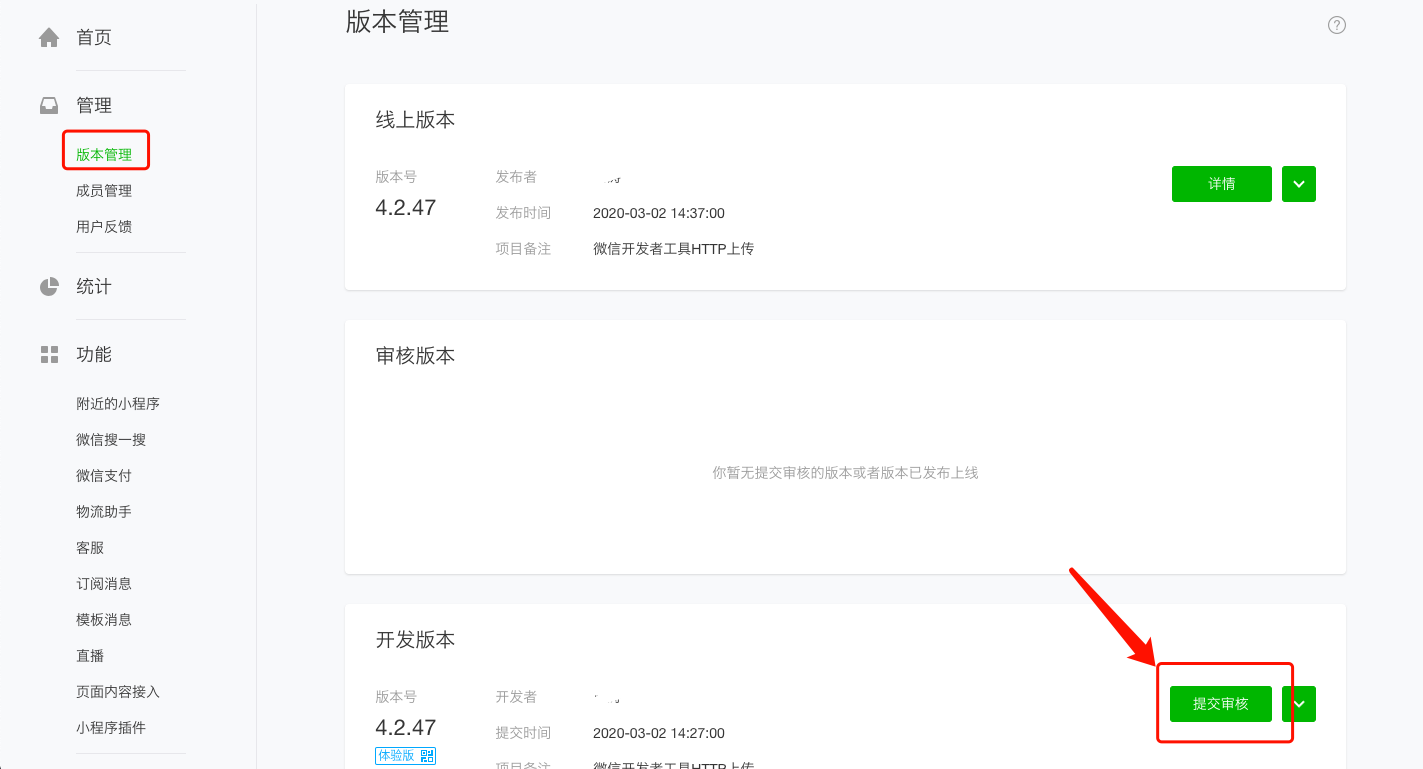 将最新的开发版本,提交审核,直接点击下一步即可,提交后,在审核版本就可以看到当前审核的版本,审核通过后,在到审核版本提交发布,发布成功后,即可看到线上版本更新了.