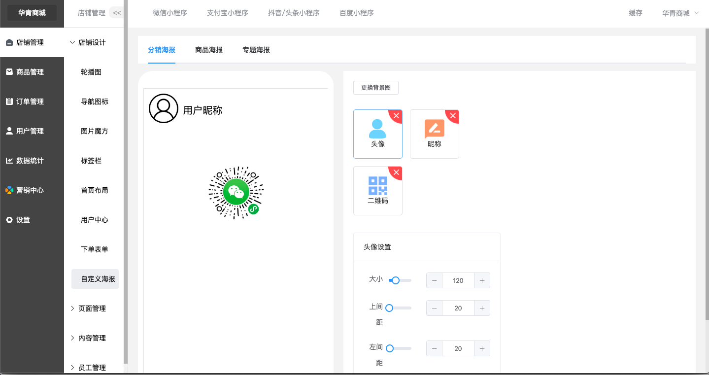 * 推广海报用于分销商-分销中心-推广海报,生成具体平台个性化的带分销商推广小程序码的炫酷海报,可直接转发也可生成图片发送给朋友或者分享在朋友圈;点击设置(1.设置背景图尺寸750x1334,,可设置个性化效果(包含分销商昵称,小程序码等大小位置颜色))