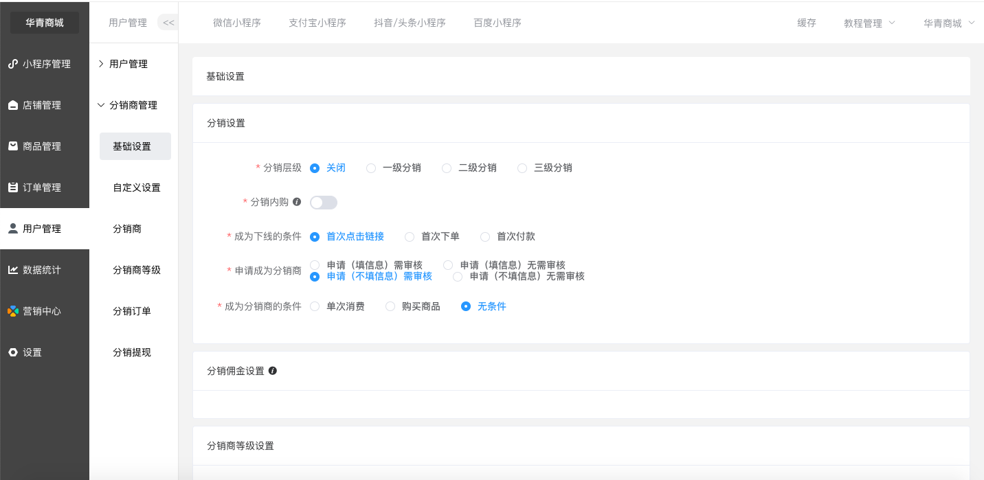* 分销层级:设置分销层级(不开启,1级,2级,3级,仅自购),是若不开启,则无法使用分销功能