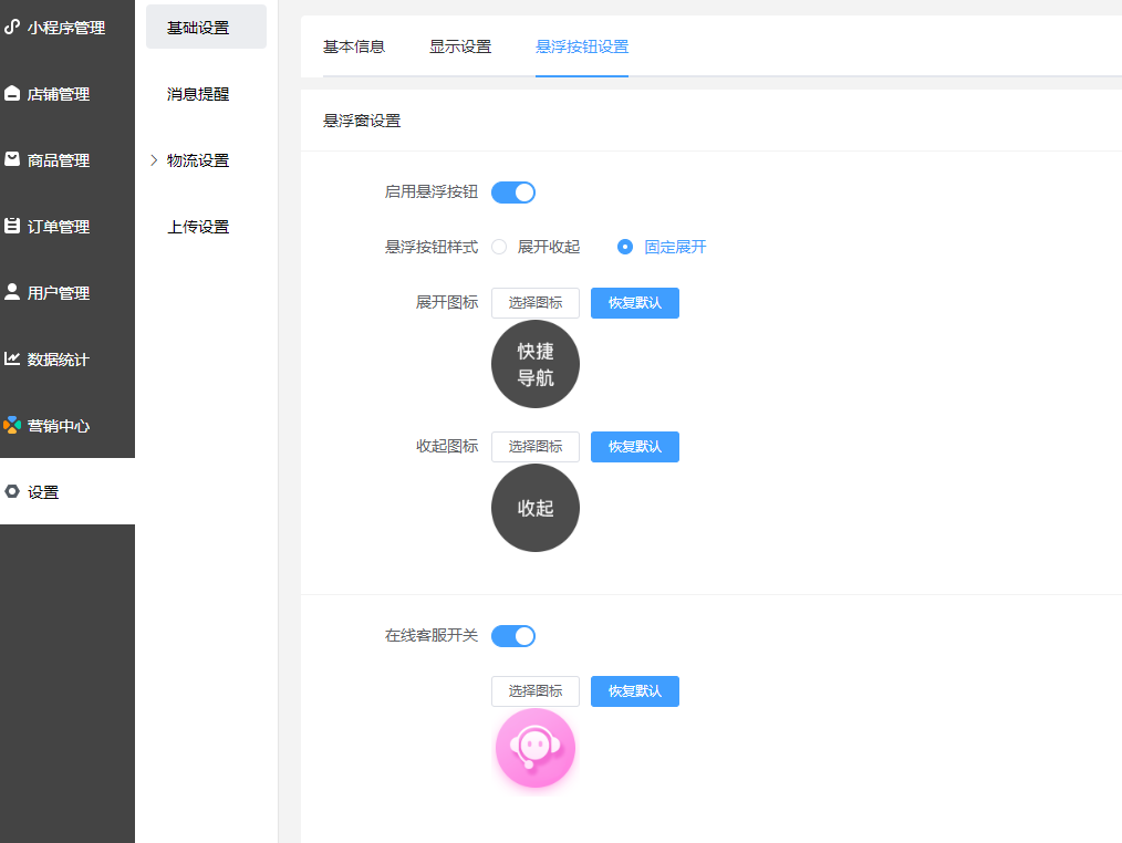 进入华青商城管理后台,设置——基本设置——悬浮按钮设置,启用悬浮按钮,在线客服开关打开,添加好了后,小程序首页刷新一下,首页右下角就会显示出来客服入口。