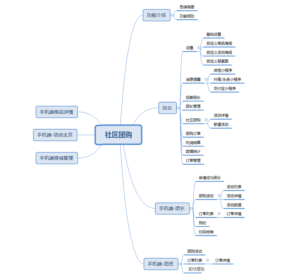 活动的参与者有商家、团长和团员;商家设置团购活动后,团长转发团购活动,且一次只能转发一个活动;团员通过团长的宣传渠道,进入到某个活动中选购商品并且下单;团购时间结束且满足最低成团标准之后(活动成功),订单将自动发货;随之商家向团长派送商品,团长收到商品之后通知团员提货;团员确认提货之后,订单视为已提货订单