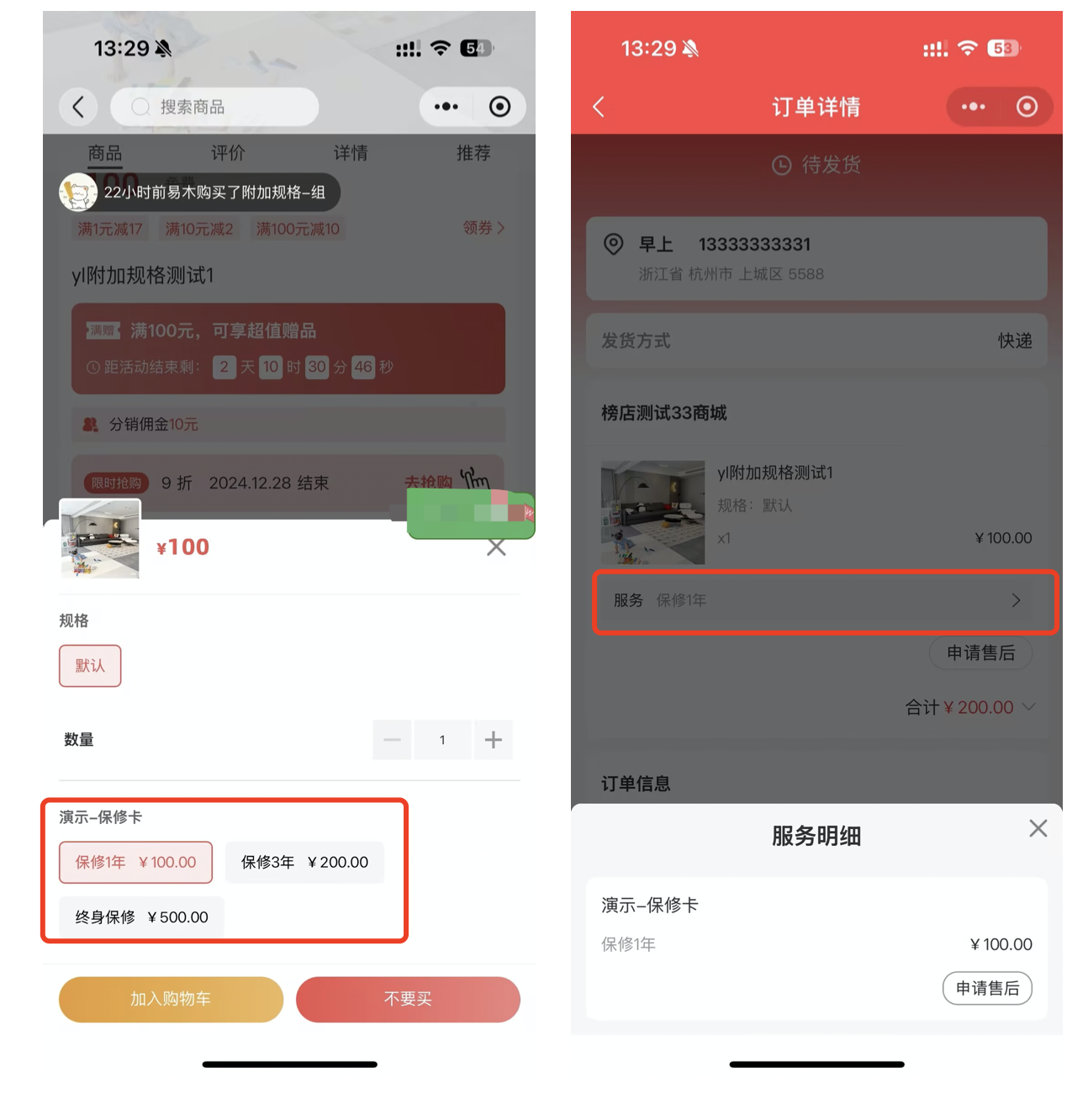 单独售后说明:开启单独售后,前端消费者用户可单独申请附加规格售后(后台同),未开启的附加规格跟随商品一起售后。