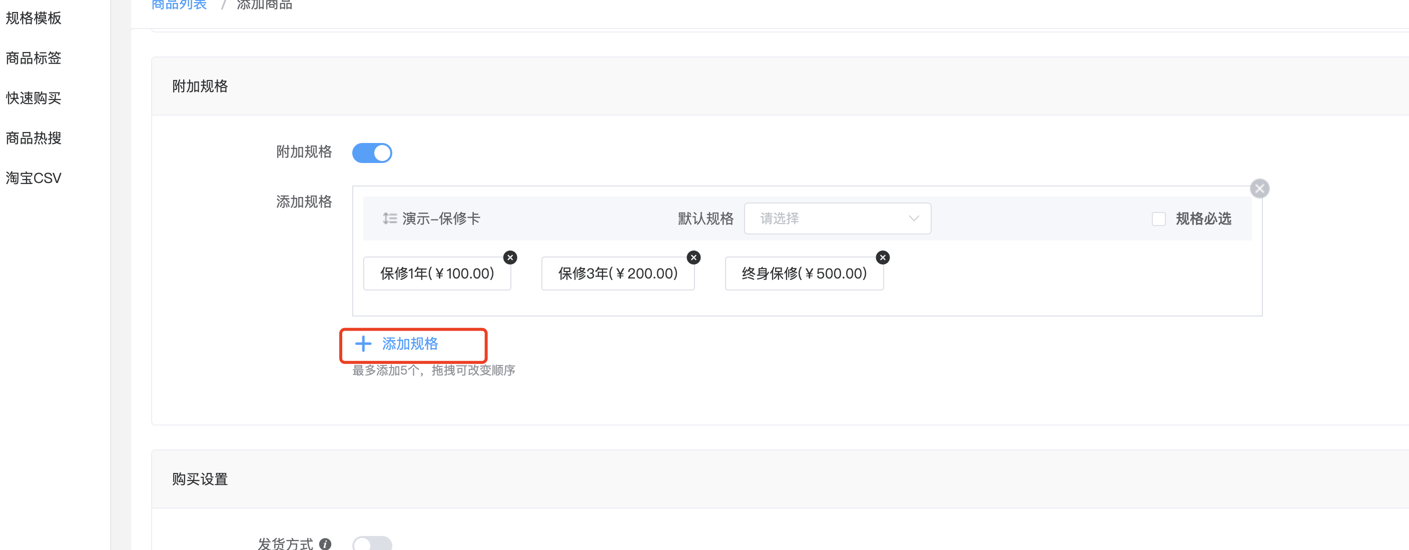 特别说明:插件拉取带有附加规格商品时,插件商品可自由设置附加规格