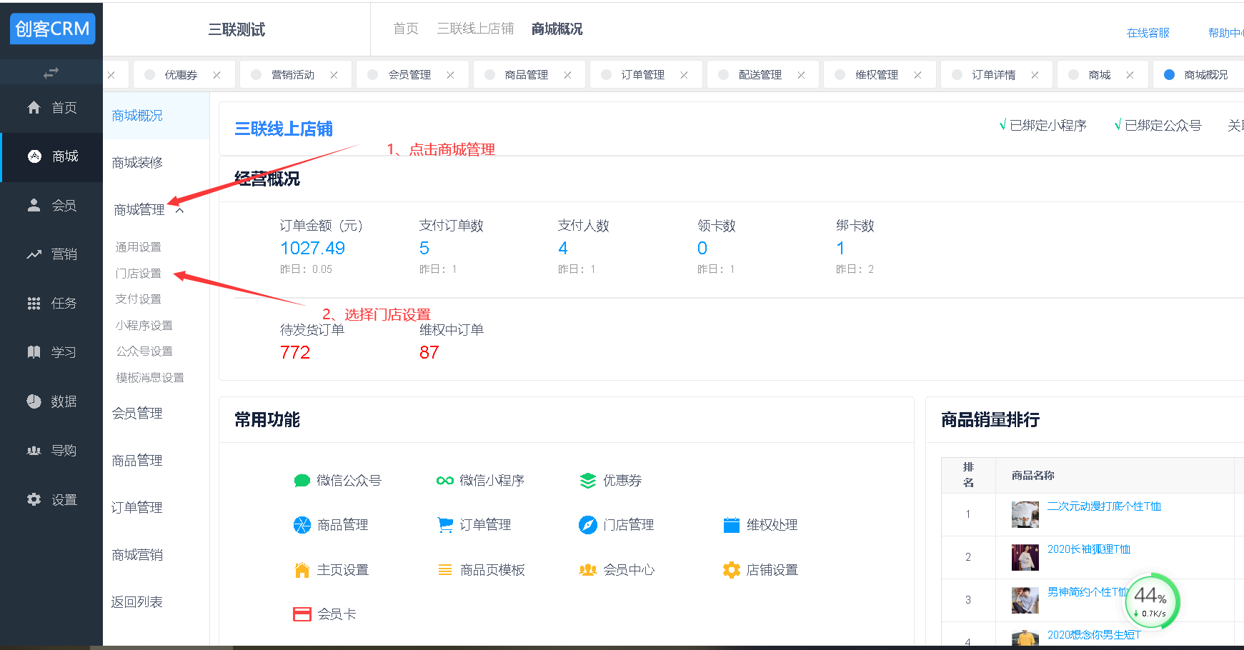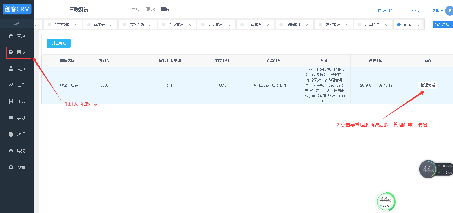 (1) 点击店铺菜单,在列表中选择管理店铺,点击店铺后的“管理店铺”