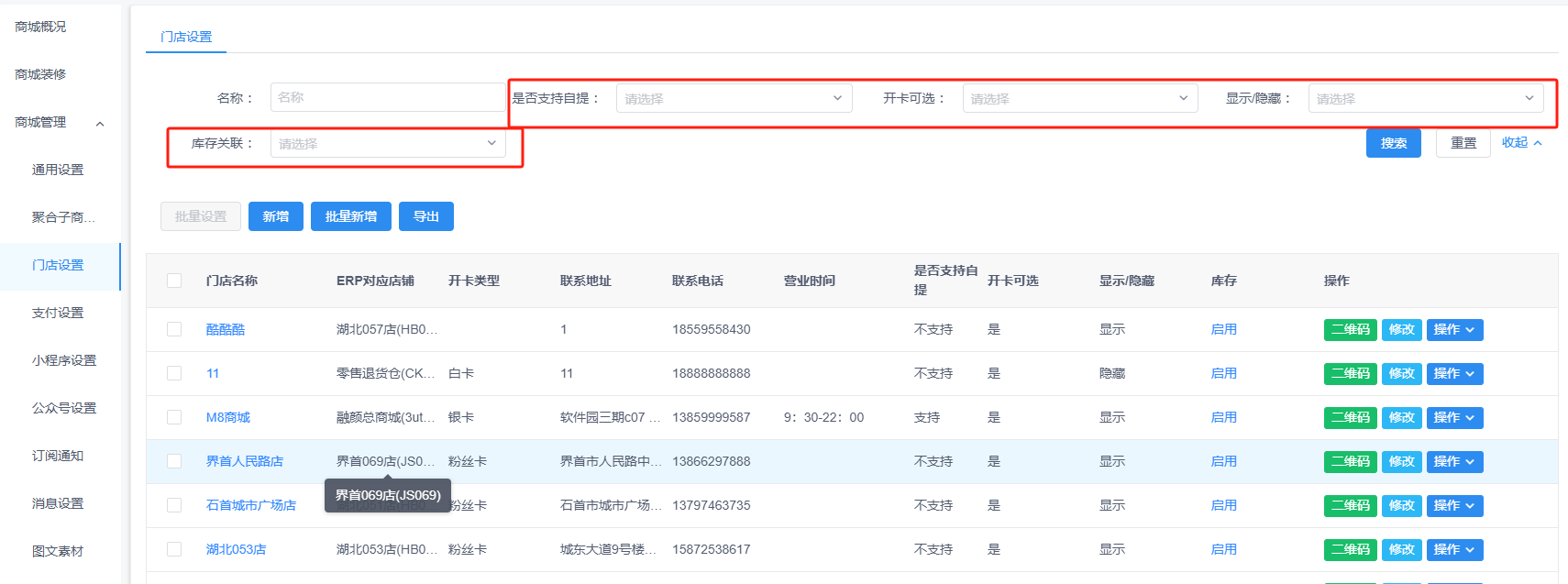 门店设置增加是否支持自提、开卡可选、显示/隐藏、库存关联筛选