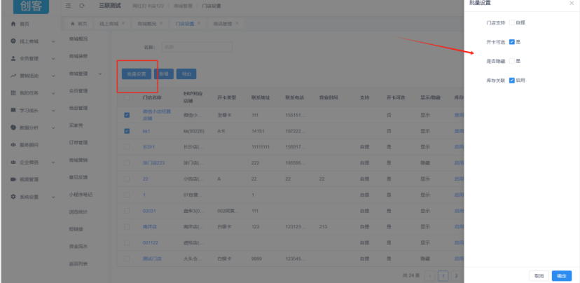 新增批量设置按钮,勾选了门店后,才可以点击批量设置按钮,可以批量设置门店的自提状态、开卡可选、是否隐藏、开启或关闭库存。