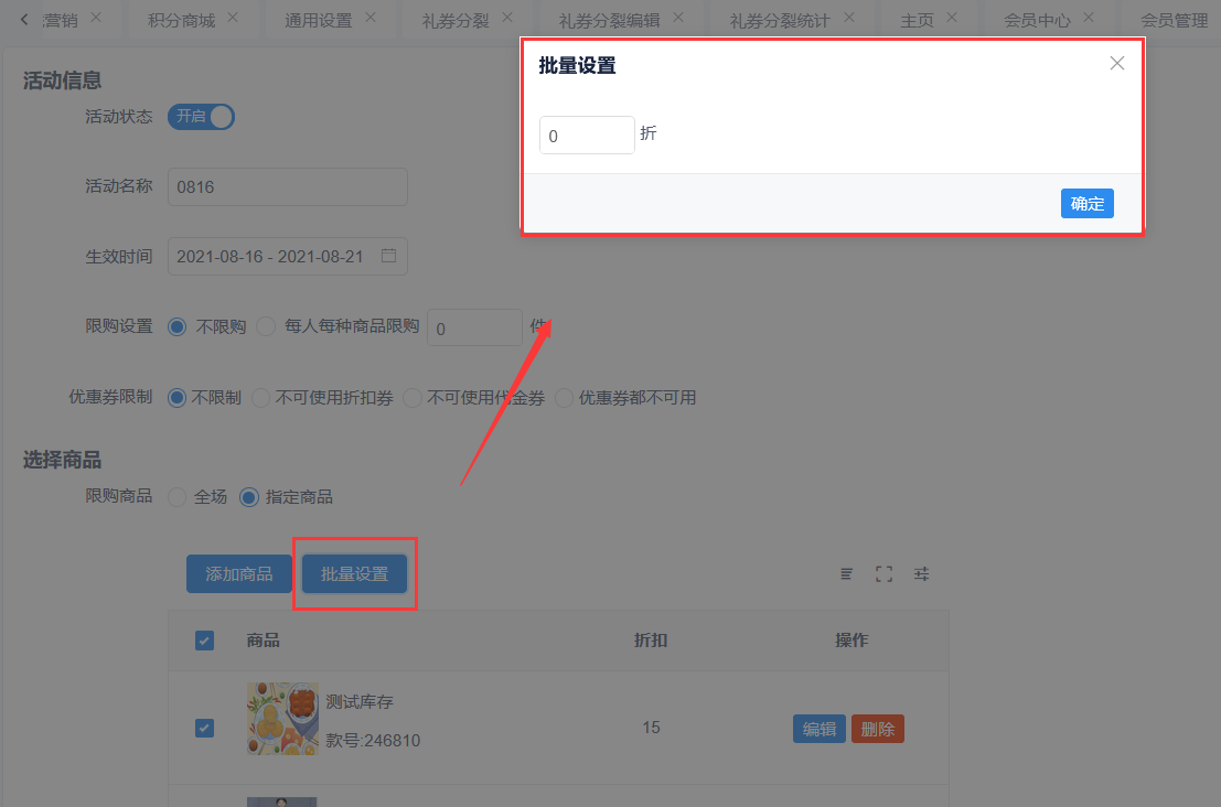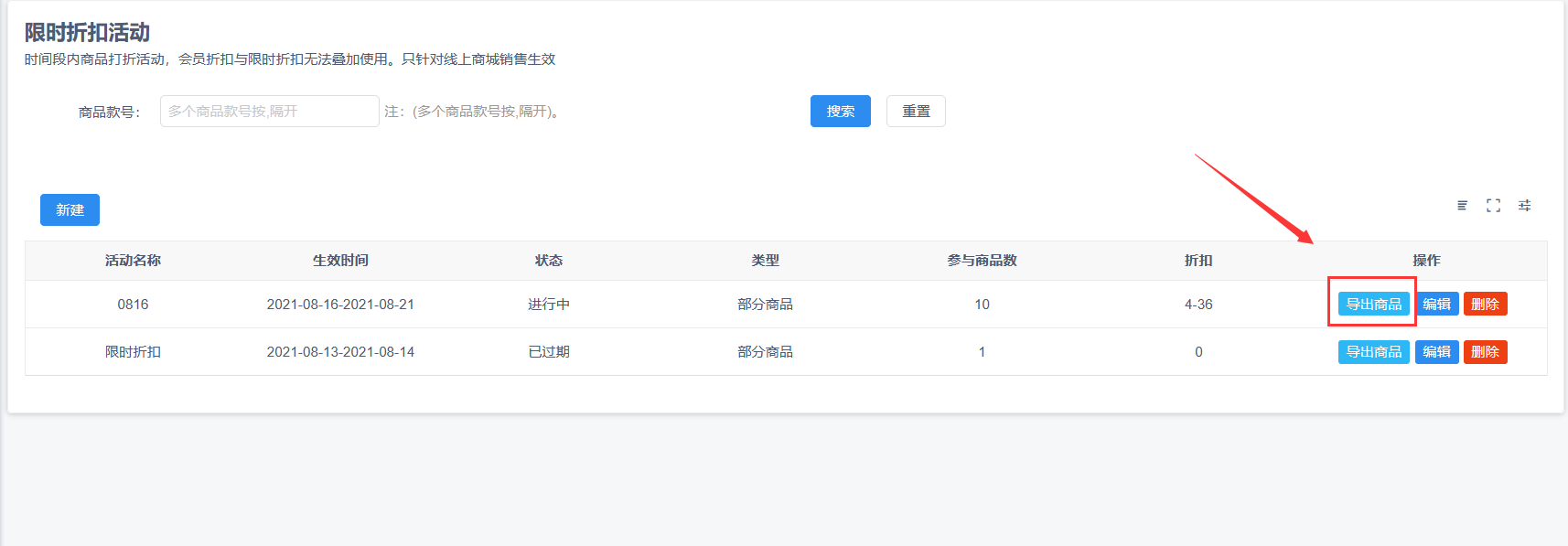 5、限时折扣活动列表增加导出商品功能,新增或编辑页增加批量设置折扣按钮。