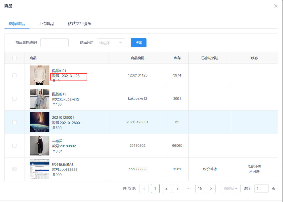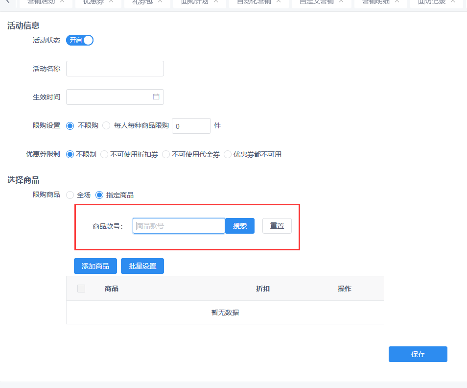 4、限时特价、限时折扣增加商品款号搜索(多个商品款号按,隔开)