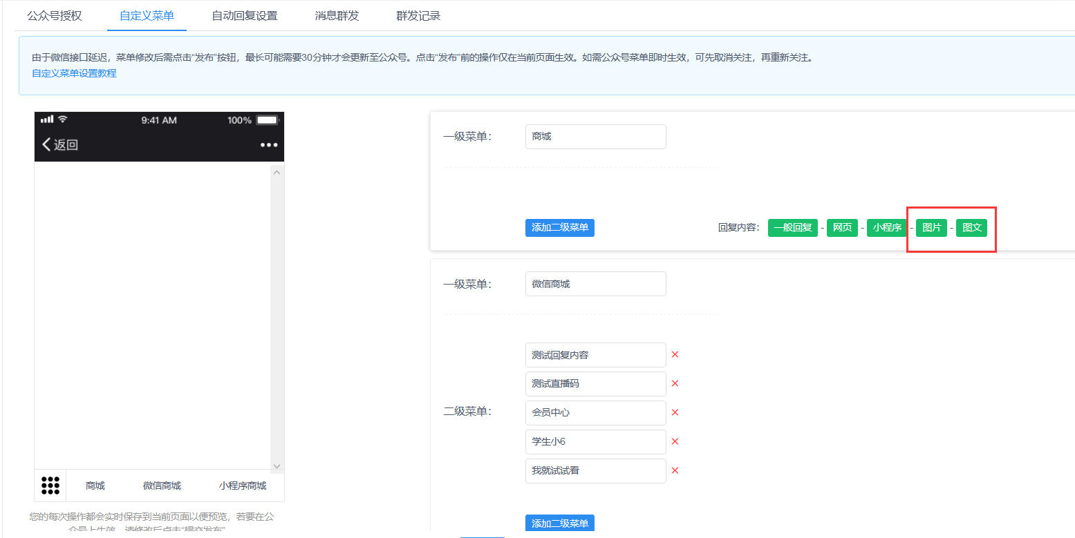 自定义菜单回复内容增加图片、图文类型