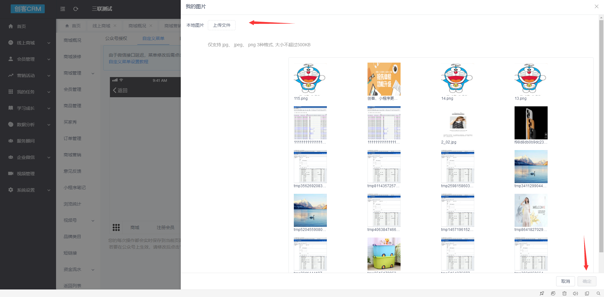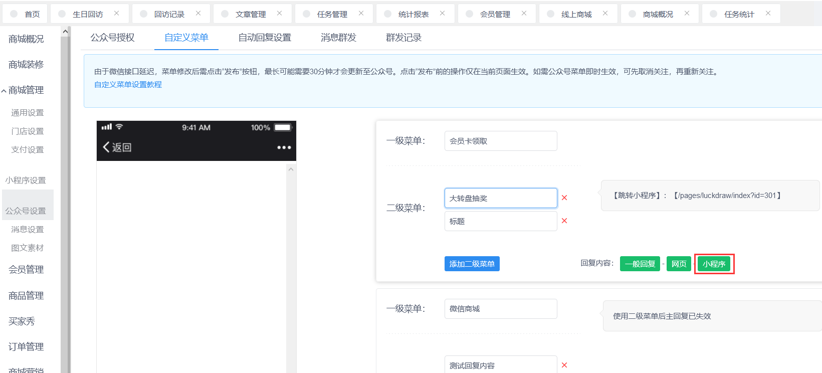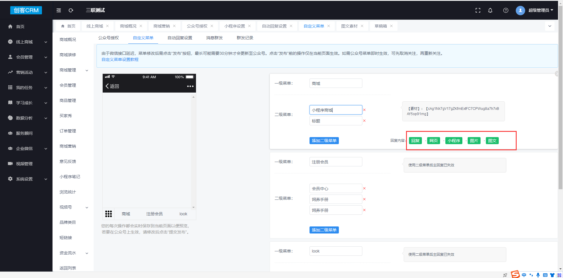 **设置路径:创客crm>商城\>商城管理\>公众号设置\>自定义菜单**