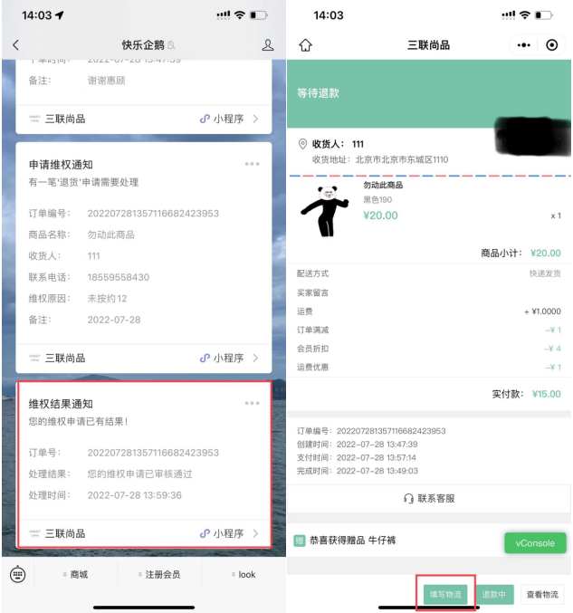 7、公众号维权结果通知点进去可以直接填写物流单号等信息