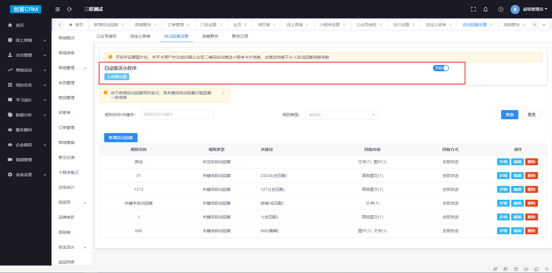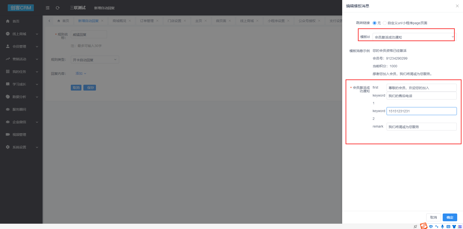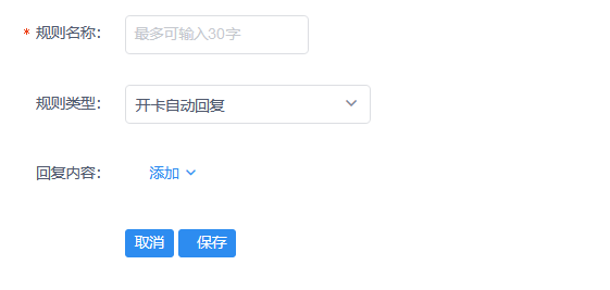 3、自动回复设置增加开卡自动回复规则