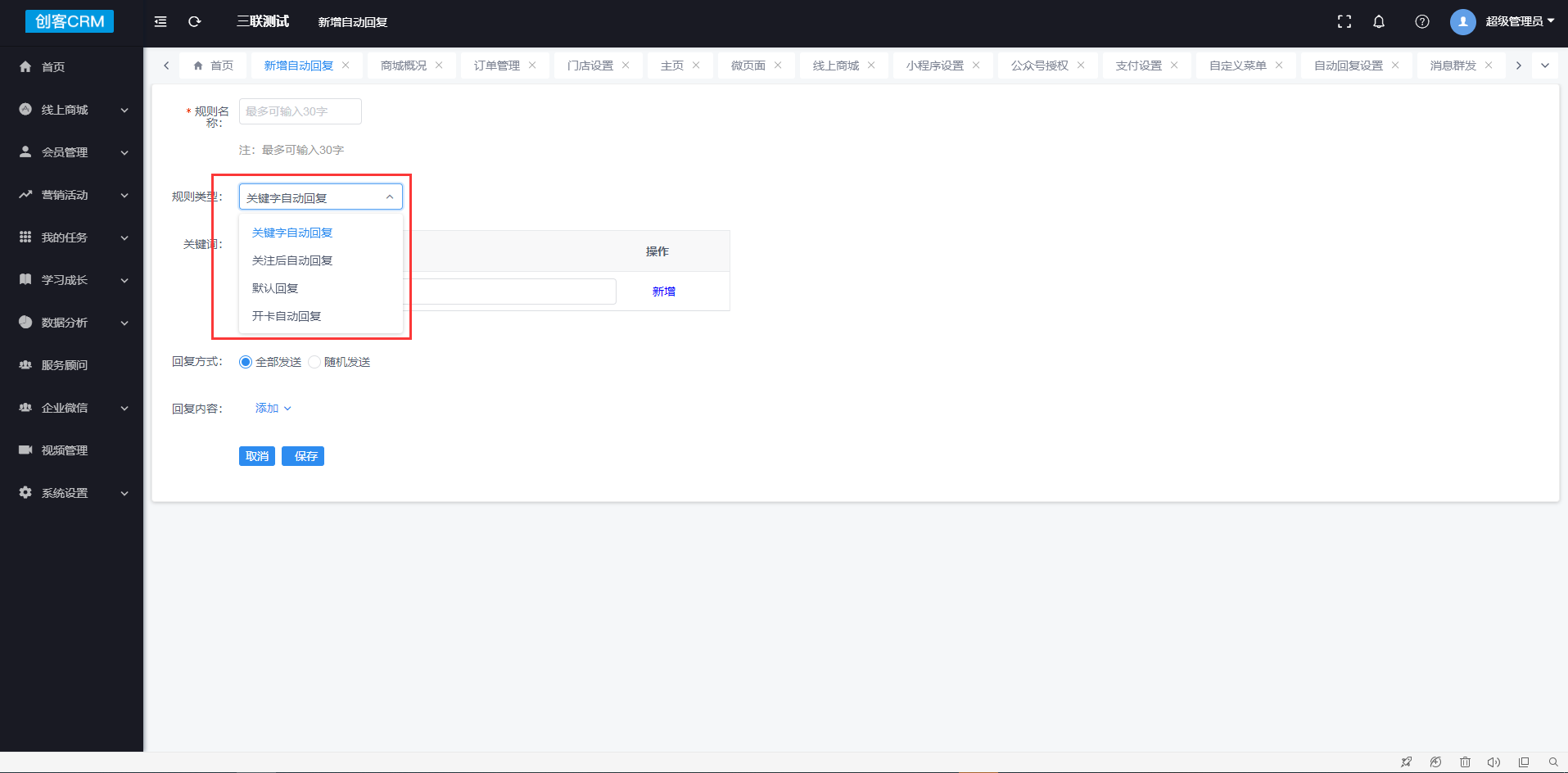点击新增自动回复进行新增:自动回复分为三种规则类型