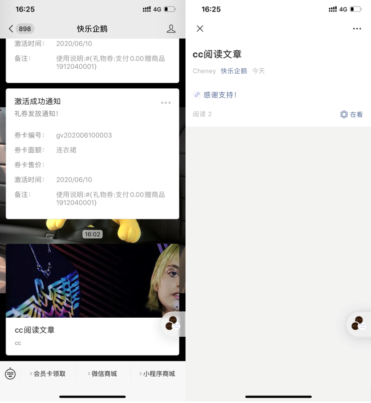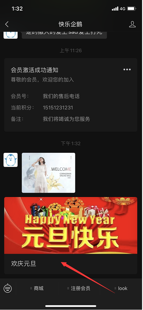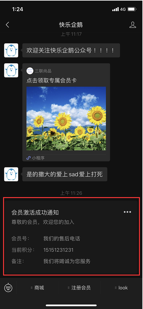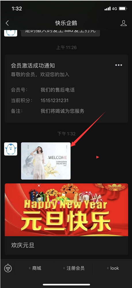 设置好之后,会员开完卡之后,公众号会自动推送消息
