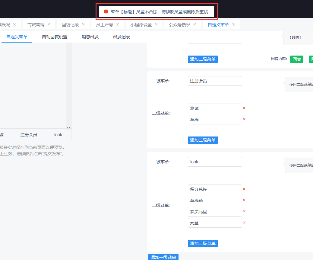 6、创客公众号管理自定义菜单添加子菜单内容为空提示