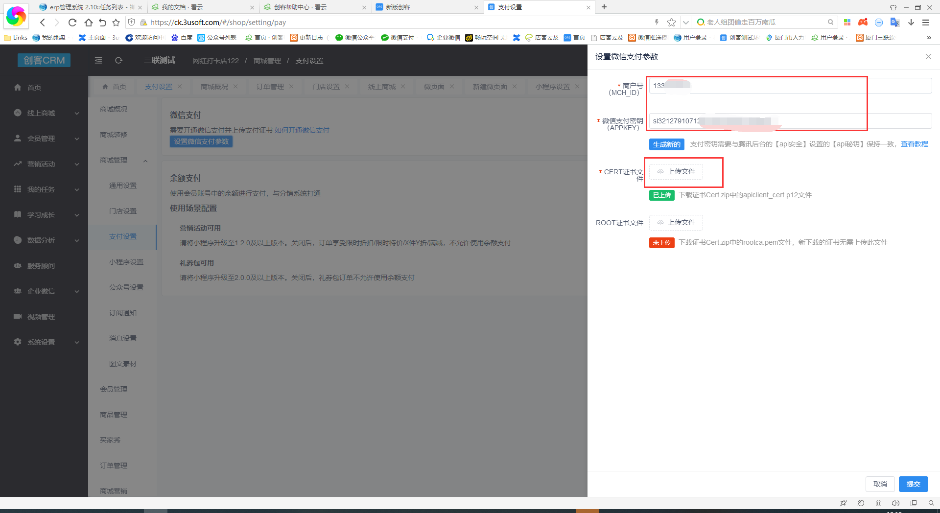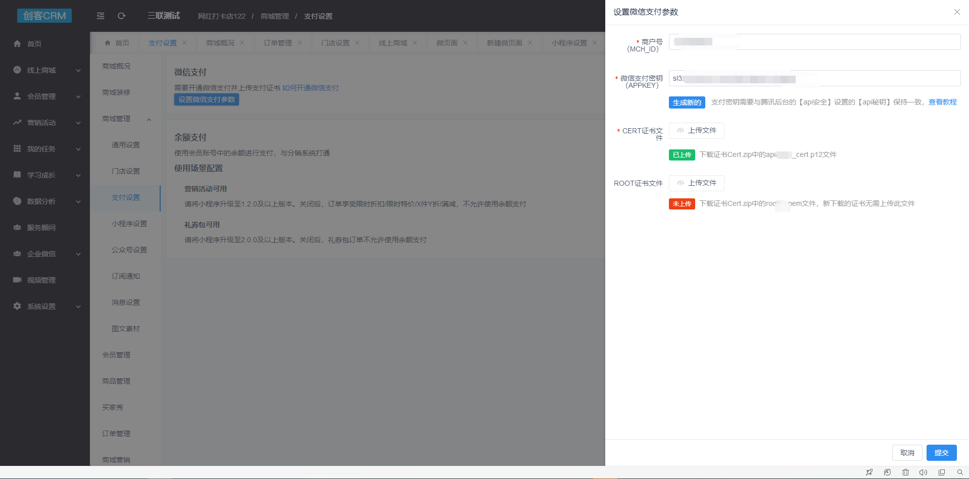 **功能路径:创客crm>商城>支付设置**