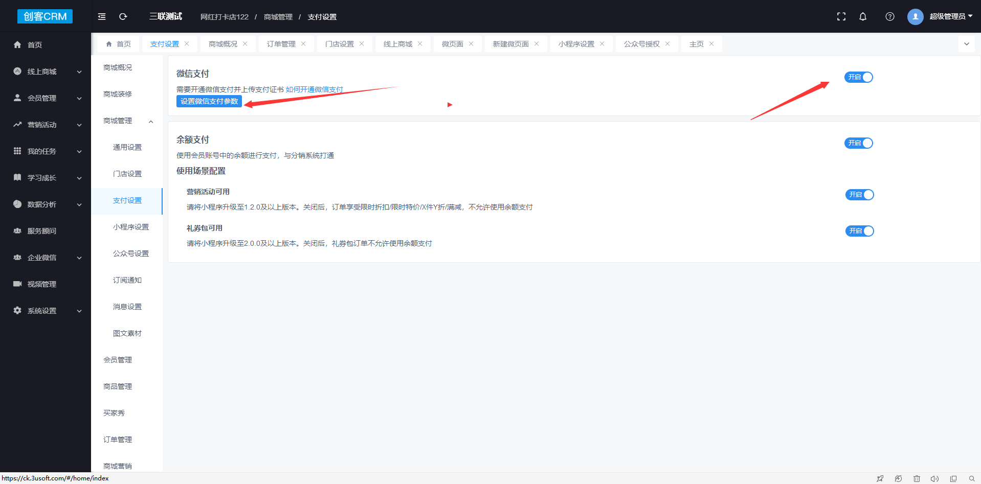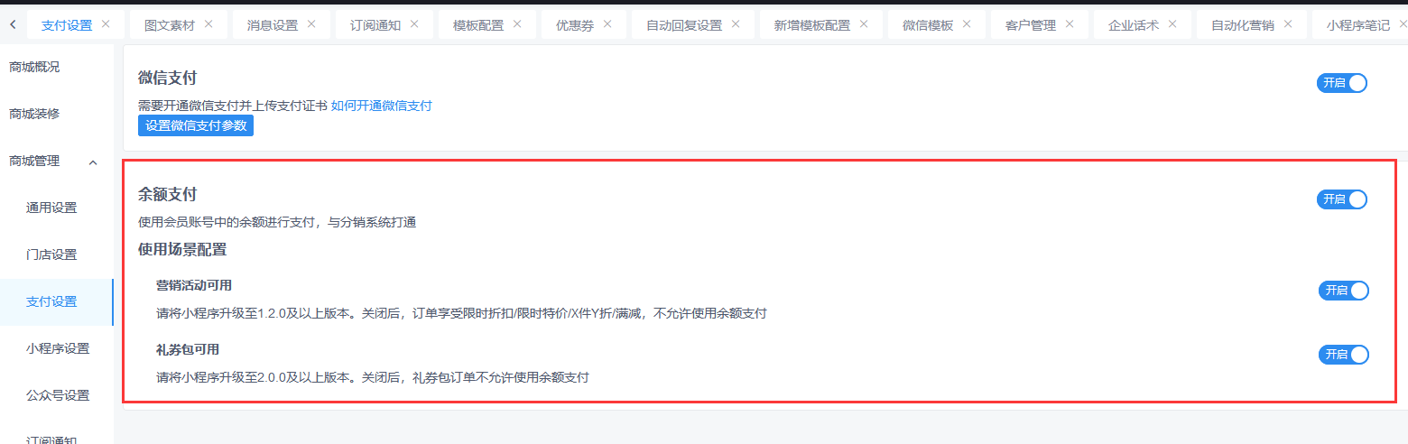 2.在创客>商城>商城管理>支付设置>开启微信支付和余额支付