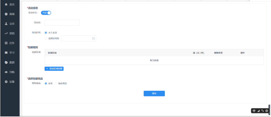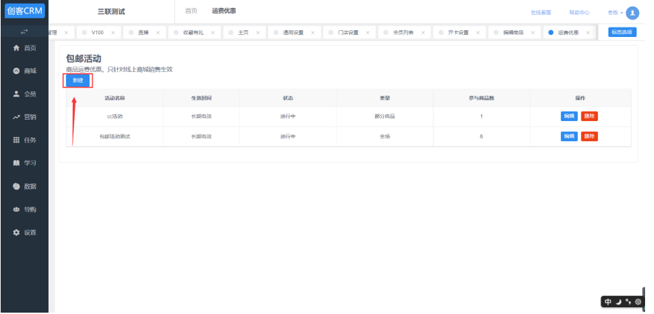 创客crm>店铺\>店铺营销\>包邮活动