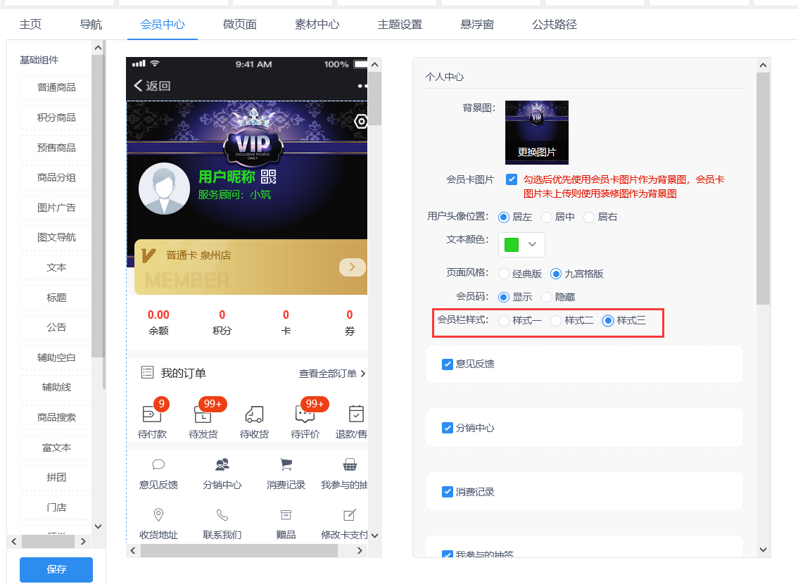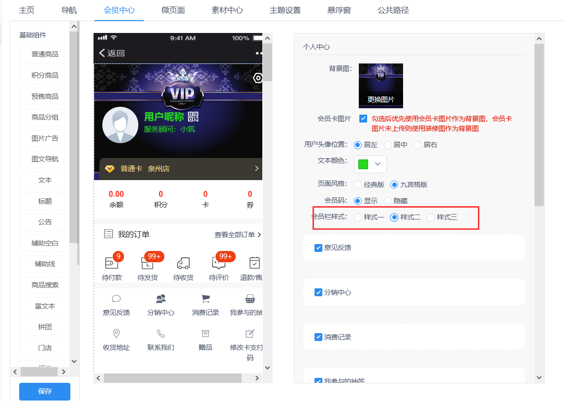 - 微页面增加会员栏组件