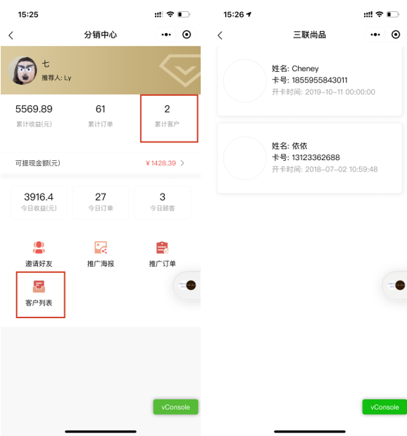微信好友开卡成功后成为你的客户,会在分销中心客户列表、累计客户显示出来。