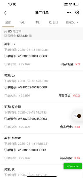 会员消费得到的返佣比例在推广订单会生成记录。