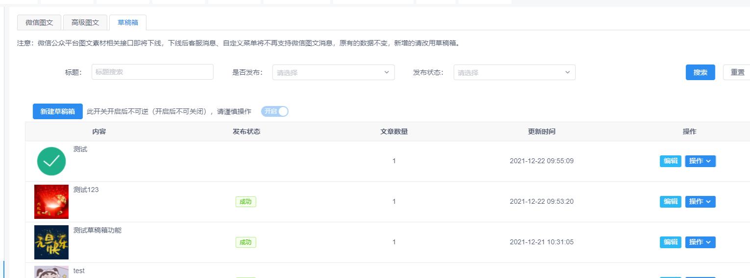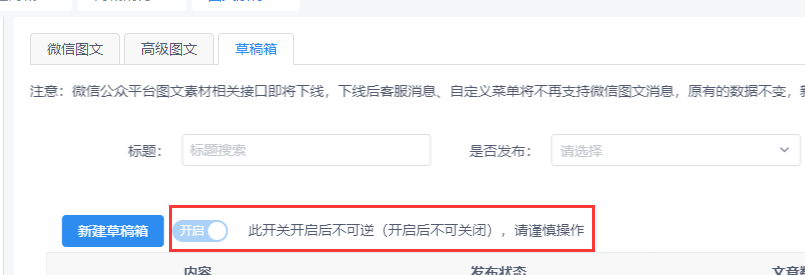1.1在图文素材页点击开启草稿箱后就不能再关闭