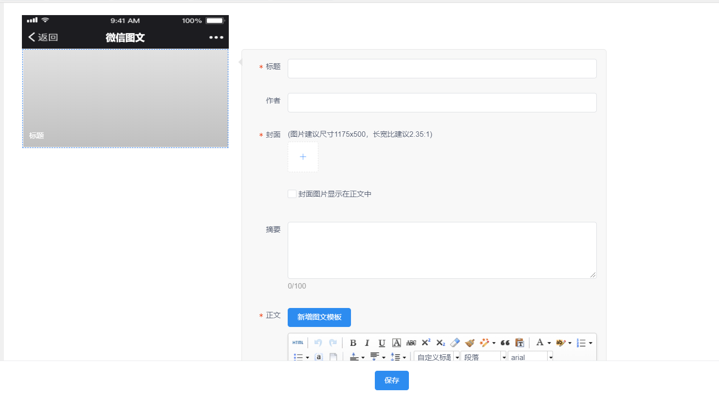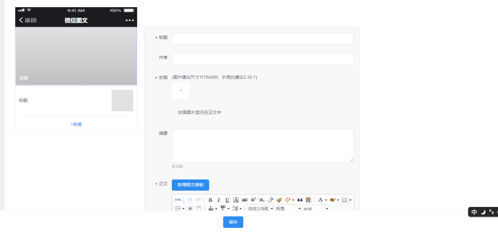 依次设置活动标题、作者、封面、摘要、正文图片、正文后点击保存生成草稿箱