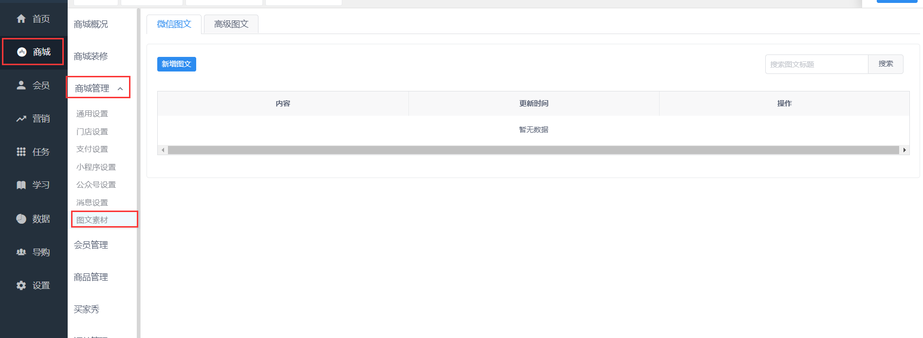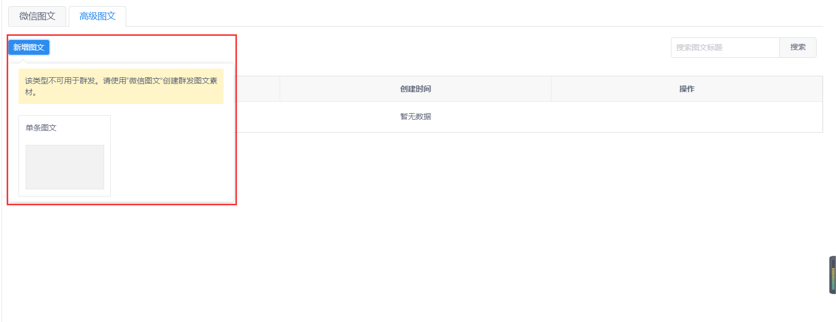 图文素材包括微信图文和高级图文两类,微信图文类型的图文又能分为单图文和多条图文两种。