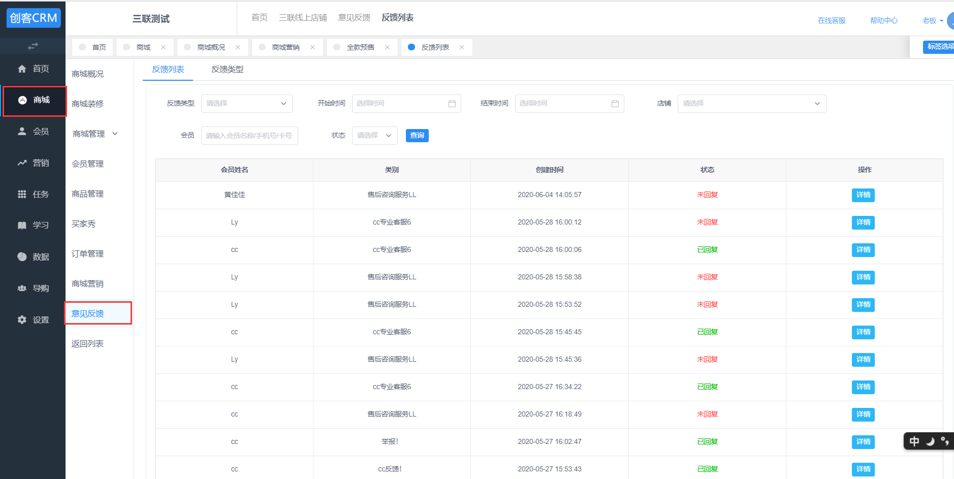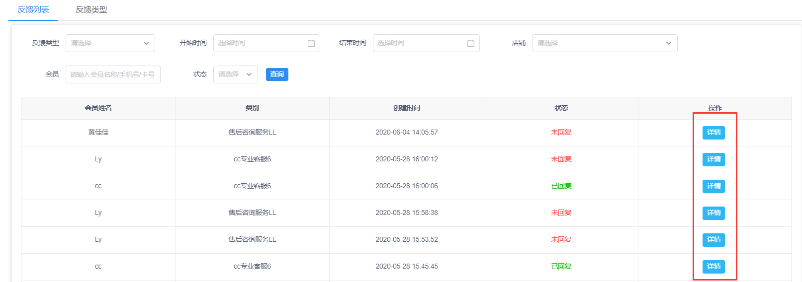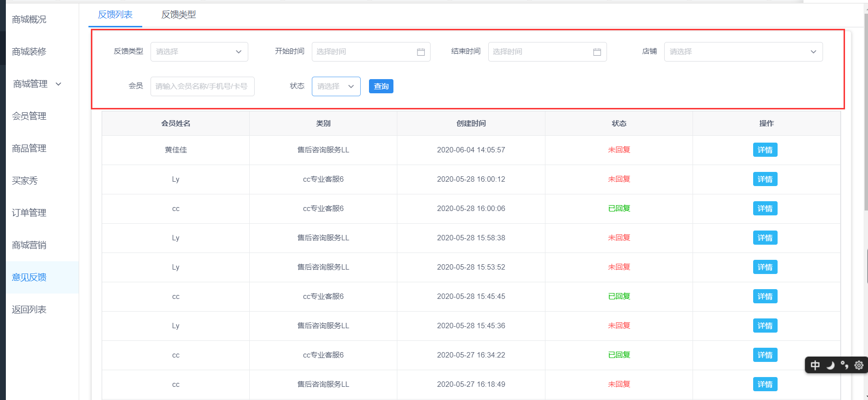 反馈列表首页可以根据反馈类型、开始时间~结束时间、店铺、会员信息、问题状态筛选查询反馈列表信息。