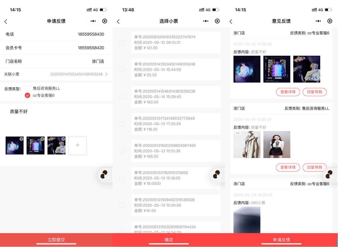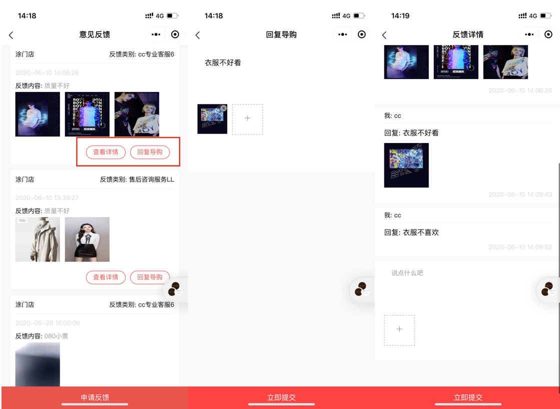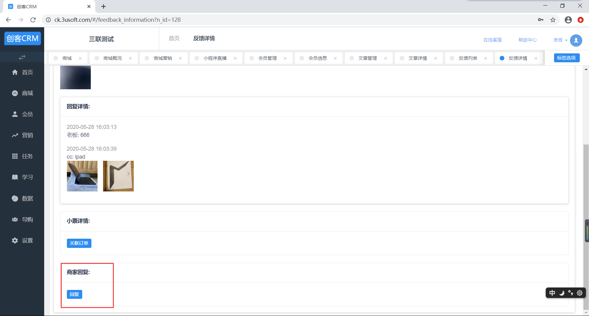 进入反馈详情页,可以查看反馈内容、和销售单或进行商家回复,顾客可以在小程序端查看回复内容。