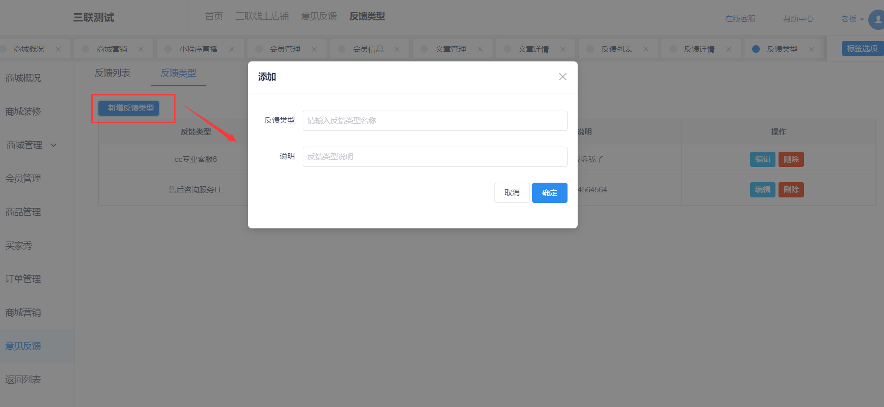 在反馈类型页面点击新增反馈类型,填写反馈类型名称和说明。