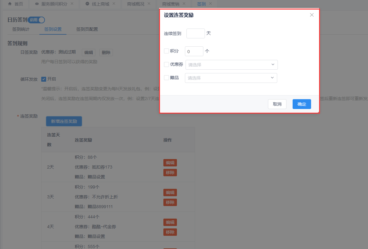 **3.设置连签奖励**,设置连续签到天数,可设置积分、优惠券、赠品(**支持多选**),客户每到达连续签到天数都能领取相应的奖励